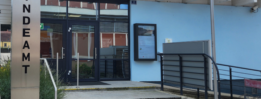 Outdoor Wandmontage, ReferenzenAuch in Sitzenberg-Reidling wurde das Design der Digitalen Amtstafel farblich an das Portal vom Gemeindeamt angepasst. Durch die flache Bauweise wird die Rampe für den barrierefreien Zugang nicht beeinträchtigt.