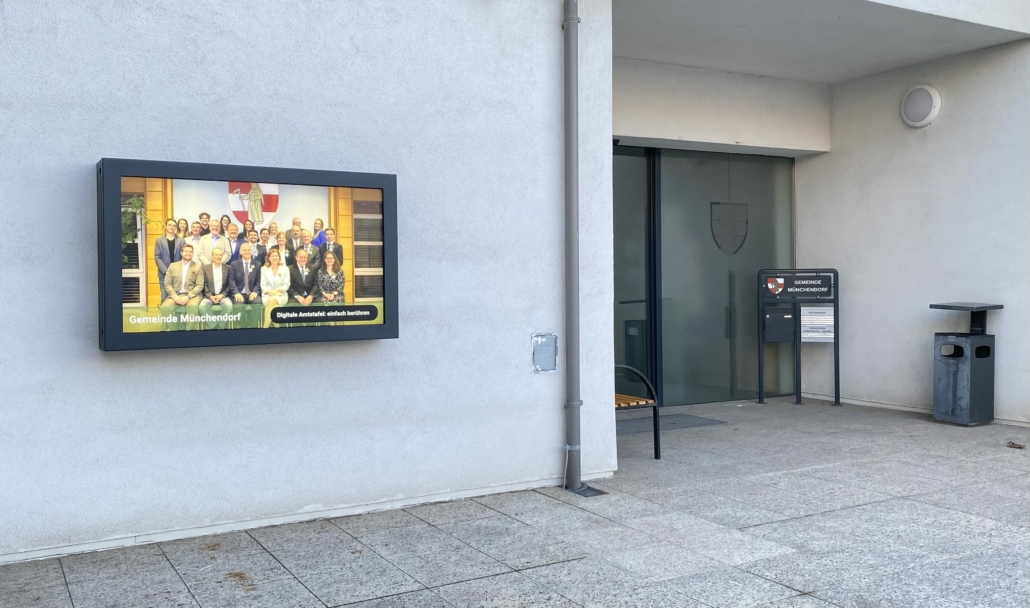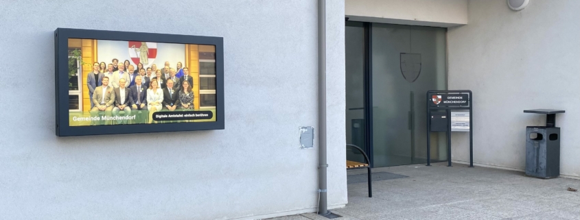 Passend zur Portalverglasung (Anthrazit matt) wurde am Gemeindeamt in Münchendorf die Digitale Amtstafel an der Fassade in Blickrichtung Parkplatz und Spar-Filiale montiert.