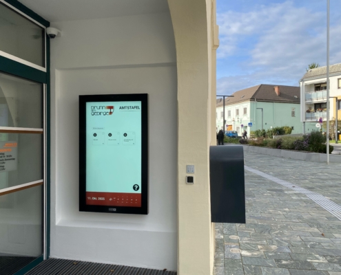 Die Architekten vom neu errichteten Gemeindeamt haben einen besonderen Standort für die Digitale Amtstafel geplant. Auf zwei Edelstahl-Stehern wurde im Windfang ein 55" Touch-Display montiert, wodurch die Bürger sofort beim Zugang auf die…